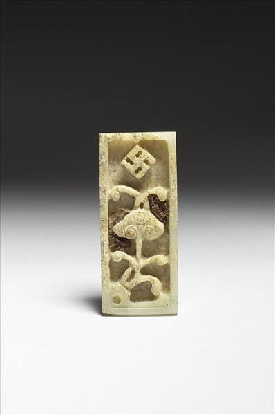 長方形玉板,正面浮雕具吉祥寓意的靈芝和卍字。背面兩對象鼻穿。此板和另外十九件(購玉363-382)組成一套玉帶。