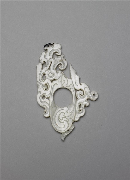 玉質,器表微微白化,邊緣局部受沁呈黑色。體扁平,中央一圓孔,左右各雕勾雲紋。下方一小孔,用來繫繩配在腰間。