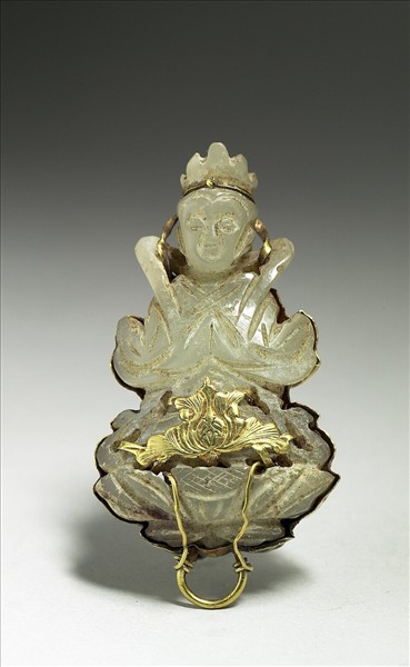 玉質,雕一菩薩坐像。背面嵌金質花托,金工甚佳,以連珠紋勾勒花托輪廓,並延伸至坐像前方,形成金質寶相花。