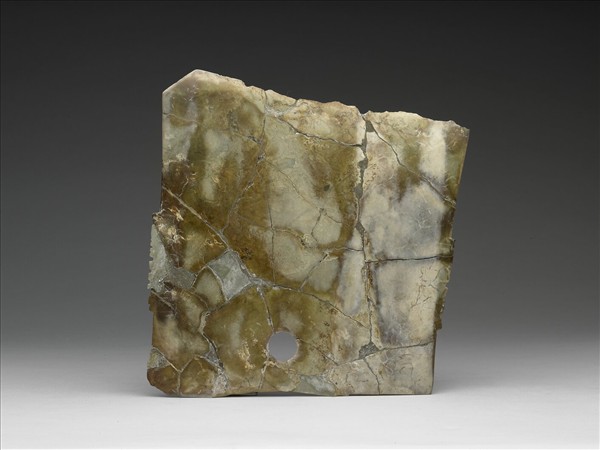 質地為斑雜結構明顯,黃褐色無透明感的閃玉。山東五蓮丹土曾出土多件這種玉料作品。此件玉戚大而厚實,可能因毀器習俗,出土時已碎成二十餘塊,經後人拼成現在模樣。當這件玉戚刃部朝上時,兩側兩面的器表各以陰線刻紋表現戴帽的側面神祖,其一有披長髮,且面頰上有一道拉長的「S」刻線。山西黎城曾出土玉戚上也有相似的戴帽、披髮、面頰刻有拉長的「S」刻線的側面神祖。以有刃玉器為神祖像載體的傳統,主要流行於黃河流域,且有越向西,紋飾越簡化的趨勢。
