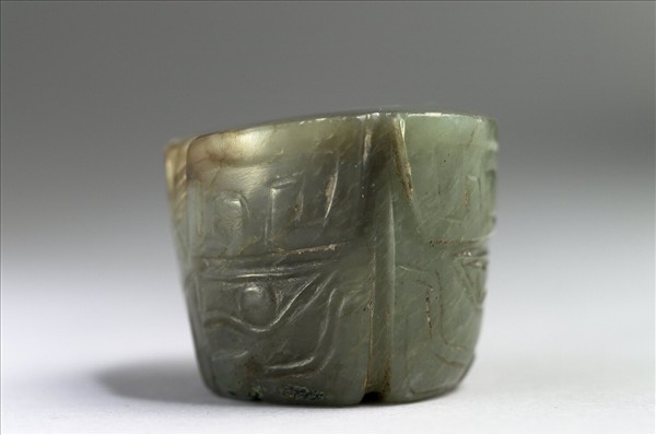 玉質,帶赭斑。器作圓柱形,略呈上大下小,可能是芯料製作而成。中有直孔。雕兩個動物面,「臣」字眼,為平行雙線勾琢出動物的眼,鼻頭、角等處,典型的殷墟風格。