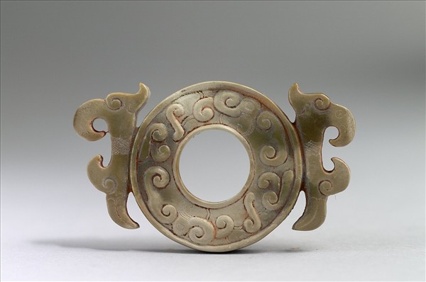 玉質,局部受沁白化,主體為一圓形系璧,飾以側面龍首紋,系璧左右兩側各飾一立鳥。
