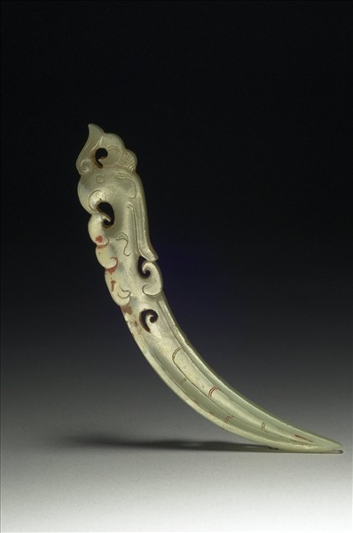 玉質,微受沁白化。玉觿最初製作時多為成對,是組玉佩之中對稱的組件,目前這件玉觿僅存一件。向下收尖的形制設計,可能是為了營造整體組玉佩的和諧美感;也因形制特殊,依形設計的鳳首呈抬頭挺胸的形貌,並簡省身尾細節。