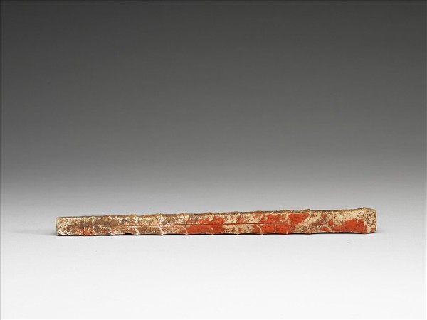 玉質,全器受沁,難以判斷原玉質顏色。器表沾有硃砂。如此造形主要出於商代遺址。