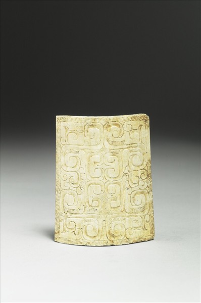 玉質,全器受沁呈黃灰色,造型弧拱,弧面裝飾變形側面龍首紋。現存一組兩件(購玉436-437)。