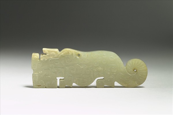 玉質,質地溫潤。琢一虎形,表面滿琢雲紋,紋飾布局並不依器形輪廓安排,也見於此時期的考古發現。