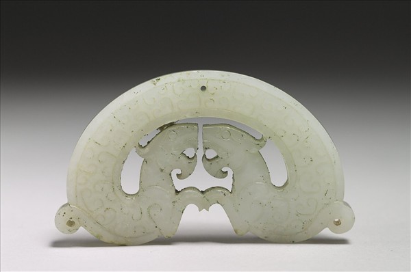 玉質,色白,微有附著物。全器中軸對稱,兩龍首對望,共用一身,龍身鋪飾雲紋。