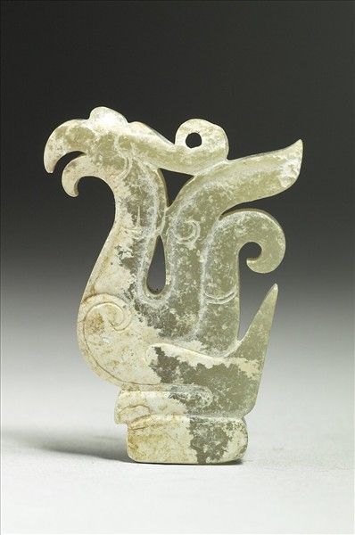 玉質,局部受沁白化。鳳鳥尾部翹起,神態自然。下端有榫,可能作為嵌飾。