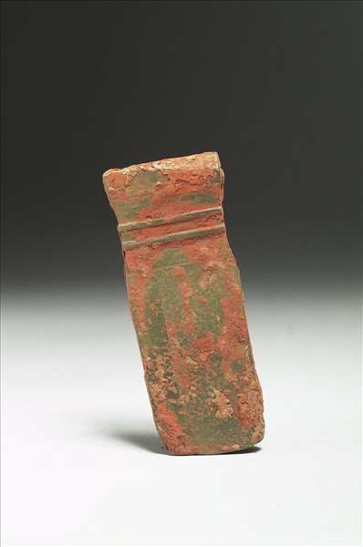 玉質,表面沾滿硃砂。此類玉器盛行於商至西周早中期,其功能意義尚有爭議。器表浮雕平行弦紋及陰刻平行線紋。