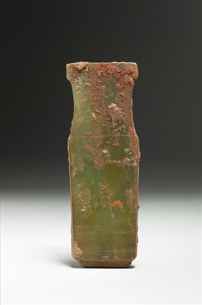 玉質,表面沾滿硃砂。長方形,製作較簡。此類玉器盛行於商至西周早中期,其功能意義尚有爭議。器表浮雕平行弦紋及陰刻平行線紋。