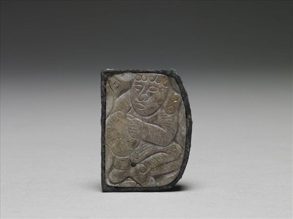 玉質,嵌入銅件中。玉帶板上琢西域胡人樂師,手持鈴鼓。