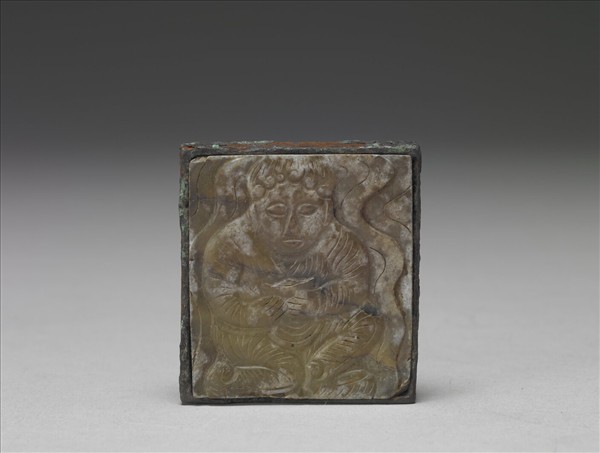 玉質,嵌入銅件中。玉帶板上琢西域胡人,手持一容器。