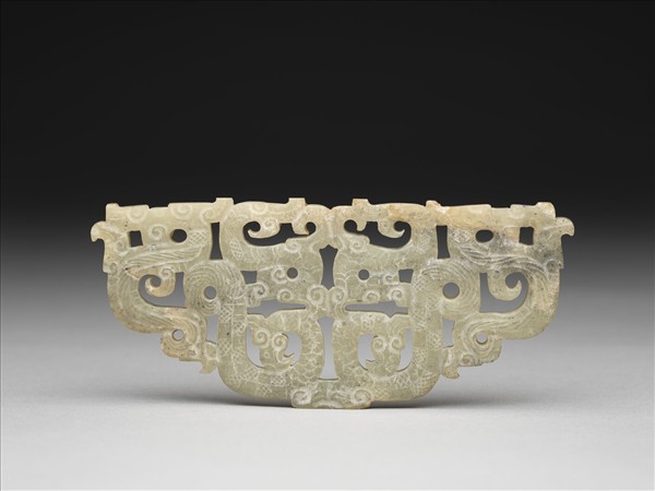 玉質,局部受沁白化,局部呈褐色。本件玉器尚未完成,可作為工序研究的樣本。
