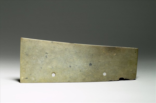 玉質不透明灰赭色,長條梯形刀。