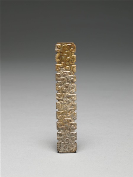 玉質,受沁為不透明之赭黃色,琢成管,管身切割為十一節,滿飾龍紋。玉組佩及小玉人共十三件。此為13件(購玉478-490)玉組佩中的一件。