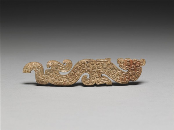玉質,全器受沁呈黃褐色。本件玉龍佩的玉質和受沁特徵皆和購玉490相同,紋飾和造形特徵也相同,主因在於這兩件玉龍佩是同一組玉佩的兩件組件,由於最終埋藏於同一環境中,所以沁色特徵相同。