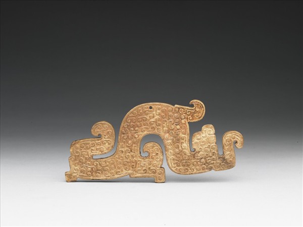 玉質,全器受沁呈黃褐色。與故玉1021年代相當;而由繫帶穿孔的位置判斷,本器也是橫放佩戴。此外,兩件玉龍的下頜和頸部之間皆以一圓孔勾勒輪廓,同是此時期常見的製作特徵,在故玉1021玉龍佩,以及山西聞喜出土的玉龍佩(M5001:87)皆可發現。