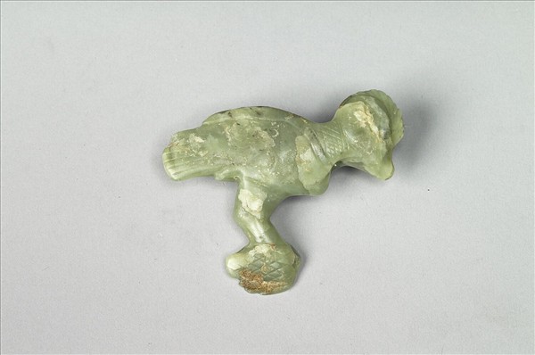 玉質,琢一生動的魚鷹在湖面抓起一尾游魚,立刻要飛起之前的姿態。鳥頸與魚身均刻畫網格紋,或象徵被漁網捕捉。鳥眼也刻做棗核形人眼。頸部有上下直穿。