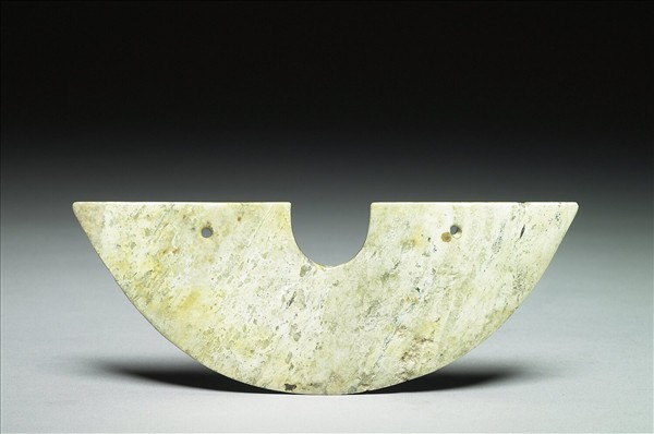 崧澤文化晚期開始流行這種近似半璧形的玉璜。此件厚薄較勻,輪廓也端正。正面磨得平整,在弧形輪廓附近器表,呈現圓弧收薄的現象,使得正面的器邊看起來似乎帶點鼓弧。背面線切割痕雖有打磨,但最深凹處不予完全磨平,留下同向不等徑的波磔。