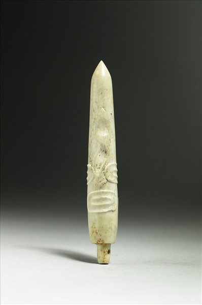 全器沁為乳白色,微帶赭色沁點。琢作圓柱體錐形器,一端形成尖端,另端為帶穿小榫。器表有明顯的切璞凹痕,並琢有四個以弦紋形成的圓圈紋。為良渚文化的頭飾。