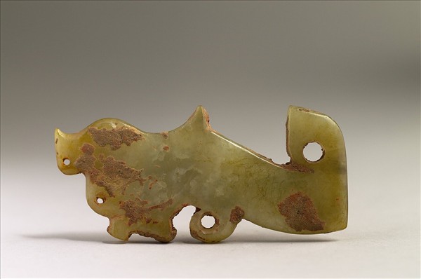 玉質,表面沾有混了硃砂的泥土。雕一側面的勾喙捲尾鳥形,喙下、胸前、腹下、捲尾等處,各有圓穿,用以佩帶。