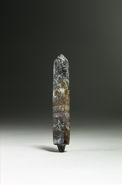 玉質,局部灰黑色,器表散布白沁斑。斷面呈寬的長方形,裝飾了一節簡化的小眼面紋。刻有平行線的二條長橫稜代表神祖的羽冠。以四個轉角為中心的短橫稜,代表神祖的鼻子。羽冠和鼻子之間有管鑽工具鑽成的圓眼,因為器身窄,所以每個圓眼可供左右二個面紋共用。全器共四個神祖面。在良渚文化墓葬中,錐形器常出自墓主頭部,被釋為插在冠帽上的裝飾。有時錐形器出土於墓主手旁。