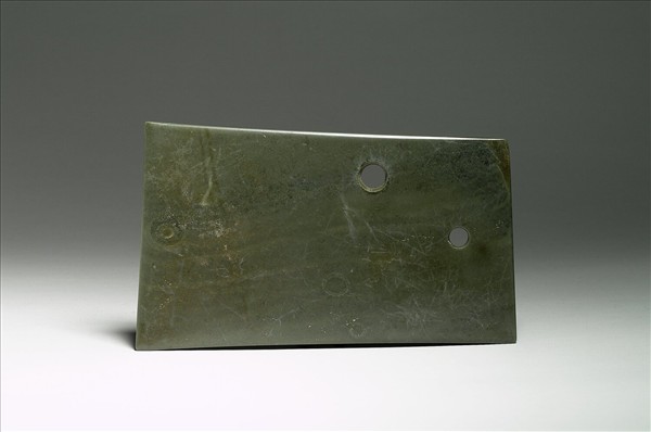 玉質,深灰綠色不透明,帶網狀淺灰綠斑。琢作不規則的四邊形,兩側邊厚薄不一,近較厚的側邊有一單面鑽鑿的圓孔,原應嵌有松綠石,已脫落。相對於刃部的一端近中點處有圓穿,其一面的上方有一小圓凹,似為曾擬鑽孔而未鑽透的痕跡。此器既大且美,應為古代象徵權力的瑞器。