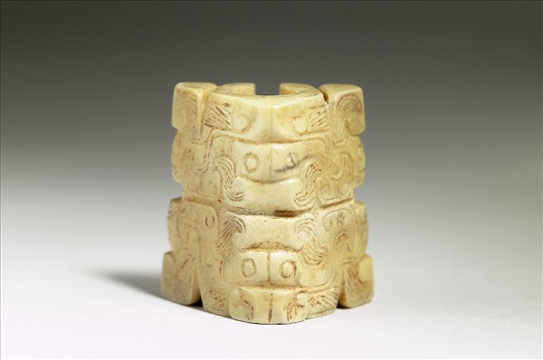 玉質,本體琢作三角形柱體,並有一直條缺口,略呈一端大,一端小。器表雕交纏的鳥紋與動物面紋。