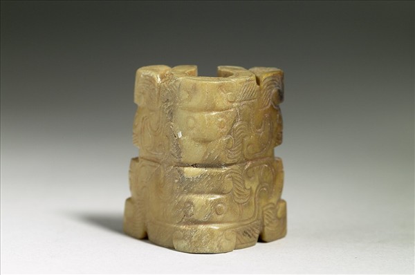 玉質,本體琢作三角形柱體,並有一直條缺口,略呈一端大,一端小。器表雕交纏的鳥紋與動物面紋。