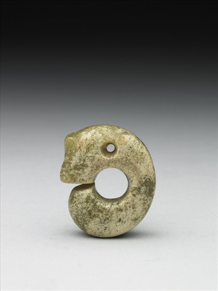 器形相似於興隆洼文化的耳飾玦,但一端雕琢似哺乳動物的頭,有皺鼻、凸眼、立耳。身軀光素彎曲似胚胎。考古學家多稱之為「豬龍」,但也有學者認為可能是描述虎的胚胎。這件小豬龍,不但器小,且從背後觀察,頸後到尾端寬度一致,這是豬龍較早階段的特徵。