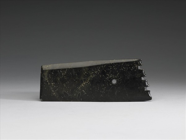 玉質,全器泛黑,局部白沁,並沾有硃砂。原應為一把玉戈,前半部已斷,由其刃線、中脊、內端的齒稜觀之,應屬商早期遺物。