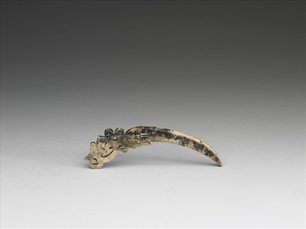玉質,全器受沁白化,局部呈黑色。啄作一龍首玉觹。