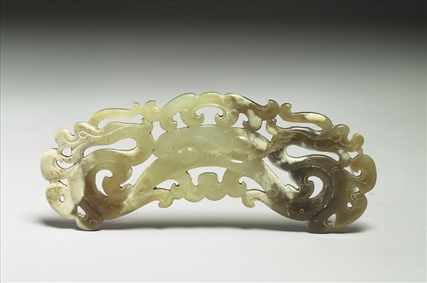 玉質,局部受沁白化。創作者善於利用多色玉料的特性,左右色深部分設計為對稱的龍首以及前半段身軀,中央色淺部分則設計為層疊的雲氧,讓後半段身尾隱沒其中,不但在視覺上巧妙延長神龍的蜿蜒身軀,也創造游移雲霄的靈動感。