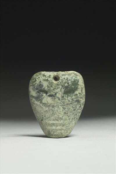玉質,沁白斑。雕作片狀人面,正面以淺寬直槽表現若隱若現的眉、眼、嘴,背面平素。上方對鑽一小穿。