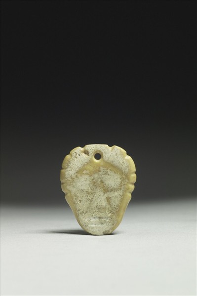 石質,經拉曼光譜測試,其質為滑石(Talc)。雕作片狀人面,正面淺浮雕五官,背面平素。中央上方一小穿。左右輪廓上以不等距凹槽表現頭髮至人耳部位。赤峰蘇達勒曾出土略相似石雕人面。
