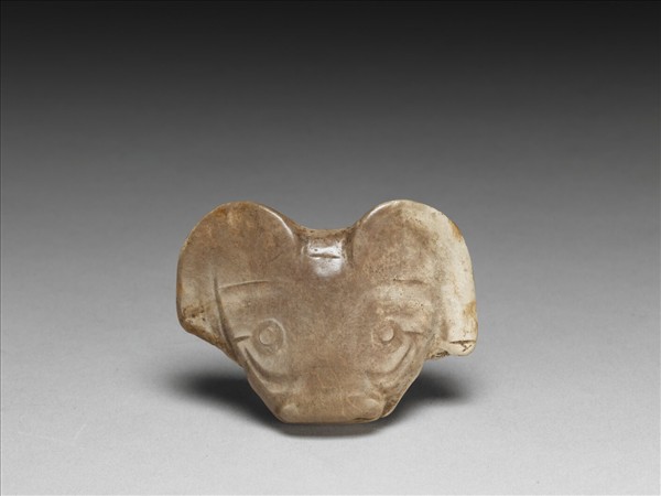 玉質,局部受沁,正面多呈褐色。淺浮雕長著小圓眼、大耳朵的獸面,兩耳下方均殘,刻畫出鼻孔與抿嘴。背面光素有隧孔,孔上方的寬脊已被繩索磨斷。