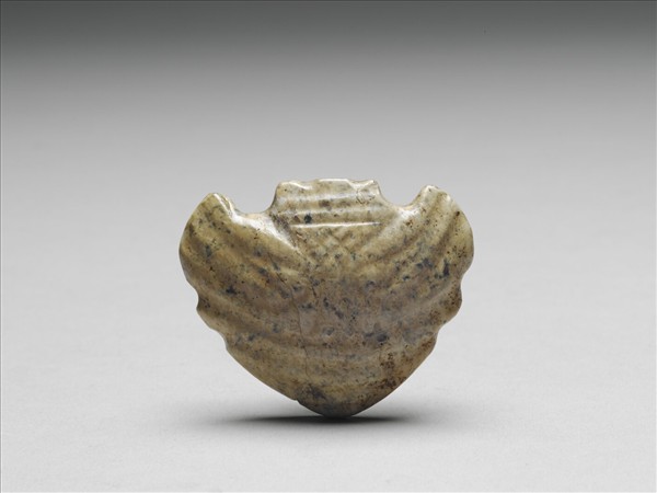 玉質,大部分沁為土黃色。正面圓拱,從中央向兩側以彎弧的寬陰紋表現抽象的五官。正中央上方琢陰線格子紋。背面光素,中央鑽隧孔,器表有相應的微凸。