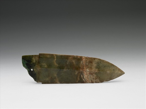 玉質,部份沁成灰白色,一處尚有編織物的痕跡,微帶硃砂痕,柄部有銅綠沁。商代時,玉戈仍屬實用器,故此戈有「援」有「內」,中脊與邊刃分明,邊線上尚有多處使用傷缺,援的中段有斷接。
