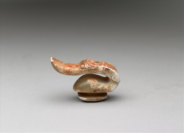 玉質,大多沁成白色,有硃砂殘留於上。此帶鉤體型較小,鉤面雕成一長嘴獸,長嘴上翹,有如鴨喙,獸角成三角尖形。額部有雲紋。