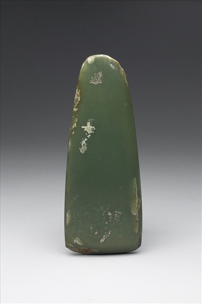 玉質,局部受沁,斧形。整個東北地區在史前時期都流行用閃玉製作厚重的玉斧,遼東地區玉斧多在柄部有穿孔,遼西及松黑地區出土的玉斧多無穿孔。應是用手握執使用。如這件玉斧的刃部有兩種不同方向的一道道短斜線磨蝕痕,證明手斧不分正反面,先民可以任意變更握拿的方向去劈砍,所以留下兩種方向的磨蝕溝。