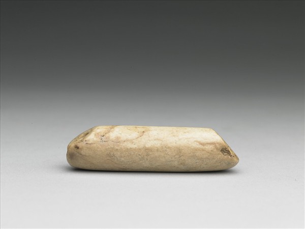 玉質,受沁成黃褐色。管徑呈不規則圓方形,器表留有片切割痕,旋轉的鑽孔工具帶動粗細不均的解玉砂在孔壁上旋轉,而留下寬窄不一的不連續旋痕。