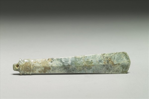 湖綠色玉,大部份沁作白斑,沁色與玻璃光很好。琢作長條似圭形,有中脊,斷面作菱形。上端較大,作三角尖狀。下端琢作三條平行凸稜。再下端有凸榫,上有小圓穿。局部有斷接。功能尚不詳。