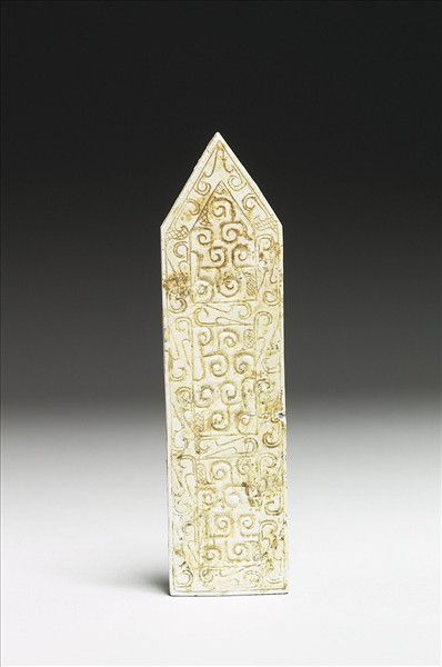 表面已深沁為不透明的牙白色,玉質不詳。琢作長方形。背面光素,黏附有咖啡色物質疑為土沁。正面雕有花紋,沿著輪廓有一裝飾帶,飾以細陰線雕成的斜三角紋。裝飾帶包圍的範圍內,以較寬的陰線,琢飾穀紋。尖首圭由戈演變而來,為重要的禮器。