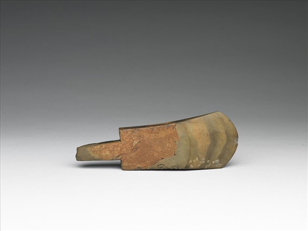 石質,表面拋光尚佳,一側邊殘留有紡織品。器身略呈長梯形而兩側邊下半部微向外侈,正面平,背面自中段至刃部,斜削而下。圓弧形刃線,柄端作中央高出一長柄,兩側直凹有肩式。刃部有使用崩傷痕。