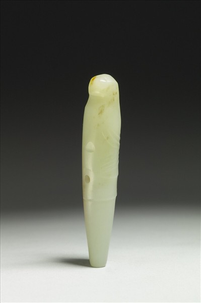 玉質,有一片赭斑,應屬玉環在河床中滾磨時,受到水中三氧化三鐵的沈積,所生的薄膜。俗稱「玉皮子」。這種保留玉皮子不予切除的情形,已出現於新石器時代的玉器上。琢一圓柱形笄,上端站立一有勾喙與冠羽雙翼交疊於後背的鷹鳥。