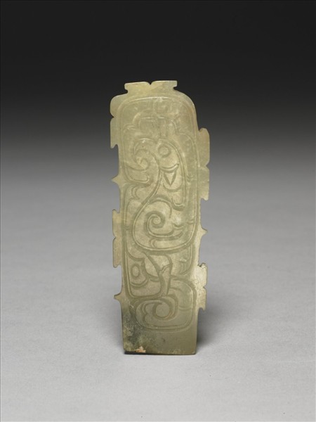 玉質,下端一小塊黑斑。琢作長方形,上邊及左右兩邊有似鳥尾或魚尾形的齒稜,兩面都雕有直立的鳳鳥紋。下端略削薄,應是嵌插於某種易腐朽的長杆上的玉件。這類玉件是典型的西周玉器。此件玉片,一面略凹,一角略斜下,是因為玉料不夠所致。