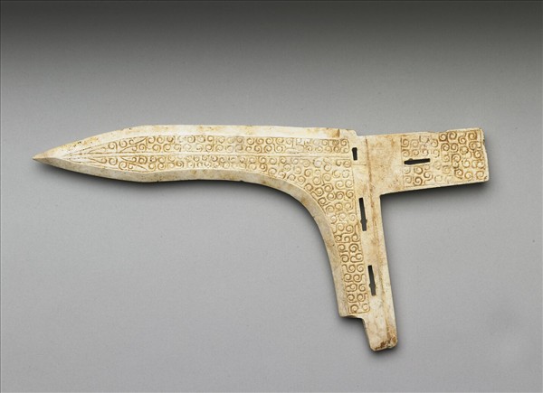 全器白化,難以知悉原始玉質。通身飾以細緻的雲穀相雜紋,說明製作年代應為戰國早期。綁縛固定用的鏤空也相當精緻,仔細觀察可知是先以實心桯具鑽磨小孔,再套線拉切而成,精細的工藝在在說明是高規格的禮儀兵器。