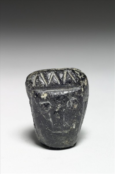 玉質,呈墨黑色,表面拋光不佳。甚厚實,似乎是利用玉子的原形,略加修整成似人頭狀。後腦杓下方有一穿孔。五官簡化而生動。