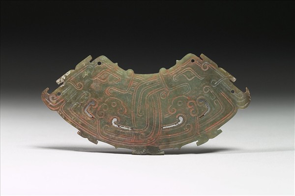 淺青綠玉,局部泛灰黑。雙面紋飾相同,以中軸為對稱軸,左右兩側為具有頭角和蛇身的神龍,中央下緣則為身軀交纏的一對耳鼻分明的神人,龍和人的形象以逗點形的鏤空區隔。 玉璜是組玉珮的組件,組玉佩是配戴在頸項並向下垂掛至腹部的串飾。本件玉璜兩側共有四個繫帶穿孔,用以串組上下的玉組件。由目前考古所知,組玉佩中的玉璜數目和墓主人的地位等級有關,數目愈多等級愈高,這種現象在西周晚期時漸成定制。 此類較簡化的神人和龍,是西周晚期常見的風格特徵。本器設計精美,表面殘留若干墓葬內棺中常見的硃砂,是研究此時禮儀文化重要的參考品。