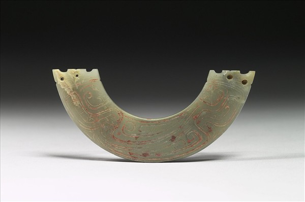 玉質,呈青黃色,有半透明感。圓弧片狀,兩面紋同。雕一對相對的龍紋,體軀抽象化為條帶狀、三角狀。為典型西周玉璜。